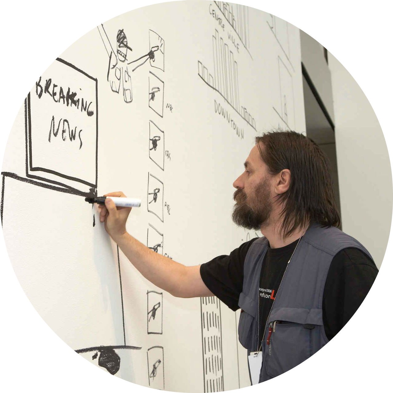 Dan Perjovschi is an artist, writer and cartoonist best known for drawing with felt pen directly onto the walls and windows of galleries in-situ during exhibitions. Commenting on current political, social or cultural issues, ideas are extracted from international news stories and his own personal observations of everyday life. He has exhibited at institutions around the world including the Rejkyavik Museum of Art, Ludwigsburg Kunsthalle, New York’s Museum of Modern Art, London’s Tate Modern and many more. In 2013, together with his wife, Lia, he was awarded the Princess Margriet Award by the European Cultural Foundation.